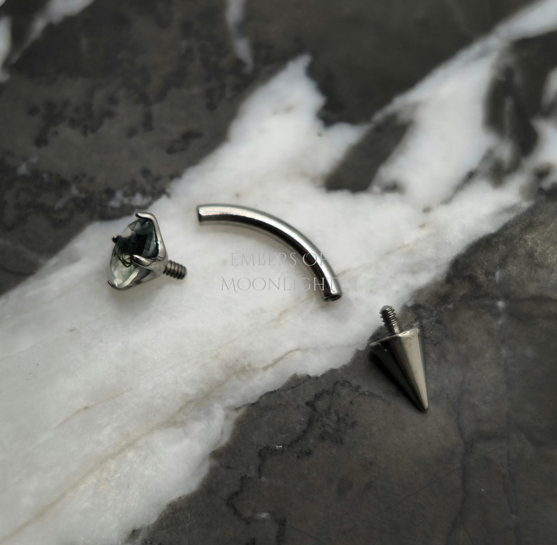 Titanium curved barbell with internally threaded ends, featuring a prong-set moss agate stone and spike